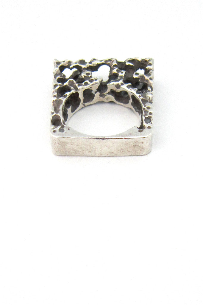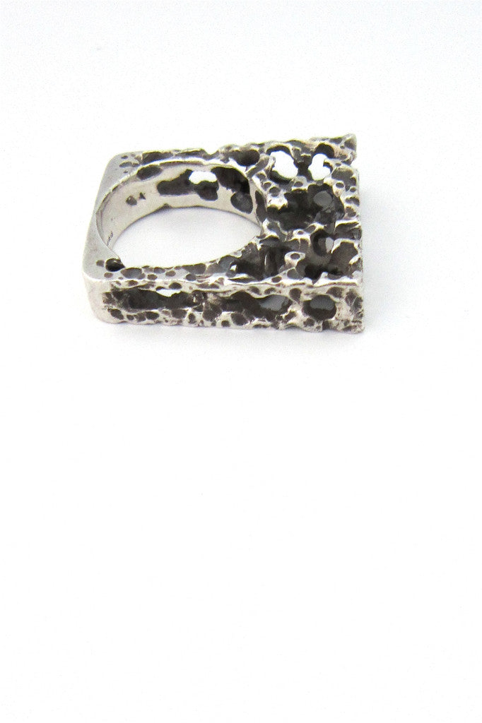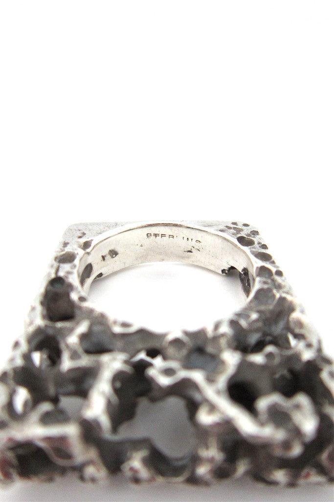 With its intricately cast piercings and craggy surfaces, this rugged and organic ring is a great piece of miniature sculpture.