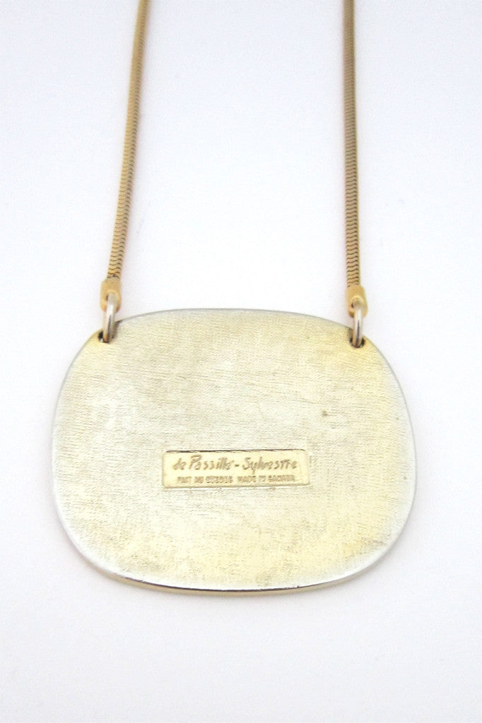 The enamelled pendant of this necklace by de Passillé-Sylvestre (Quebec 1960s - 1970s) features a stylised image of a woman freeing a bird from a gilded cage.