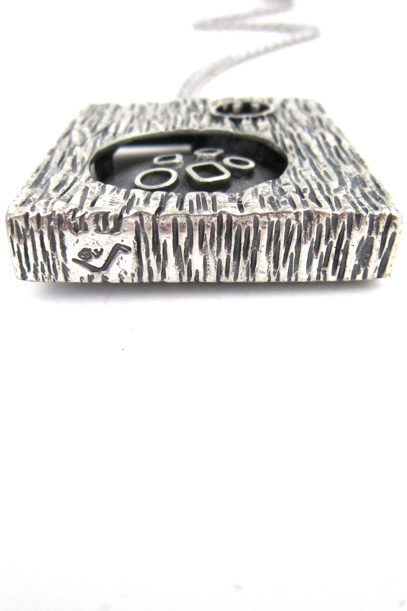 One of Guy Vidal's best and most sought-after pendant necklaces is this double sided sculptural shadow box. It features his signature use of many, varied surface textures and elements, all set in high relief against their deeply patinated background. The open spaces around the two main elements allow light to play through, adding further depth and interest to this wonderful piece.