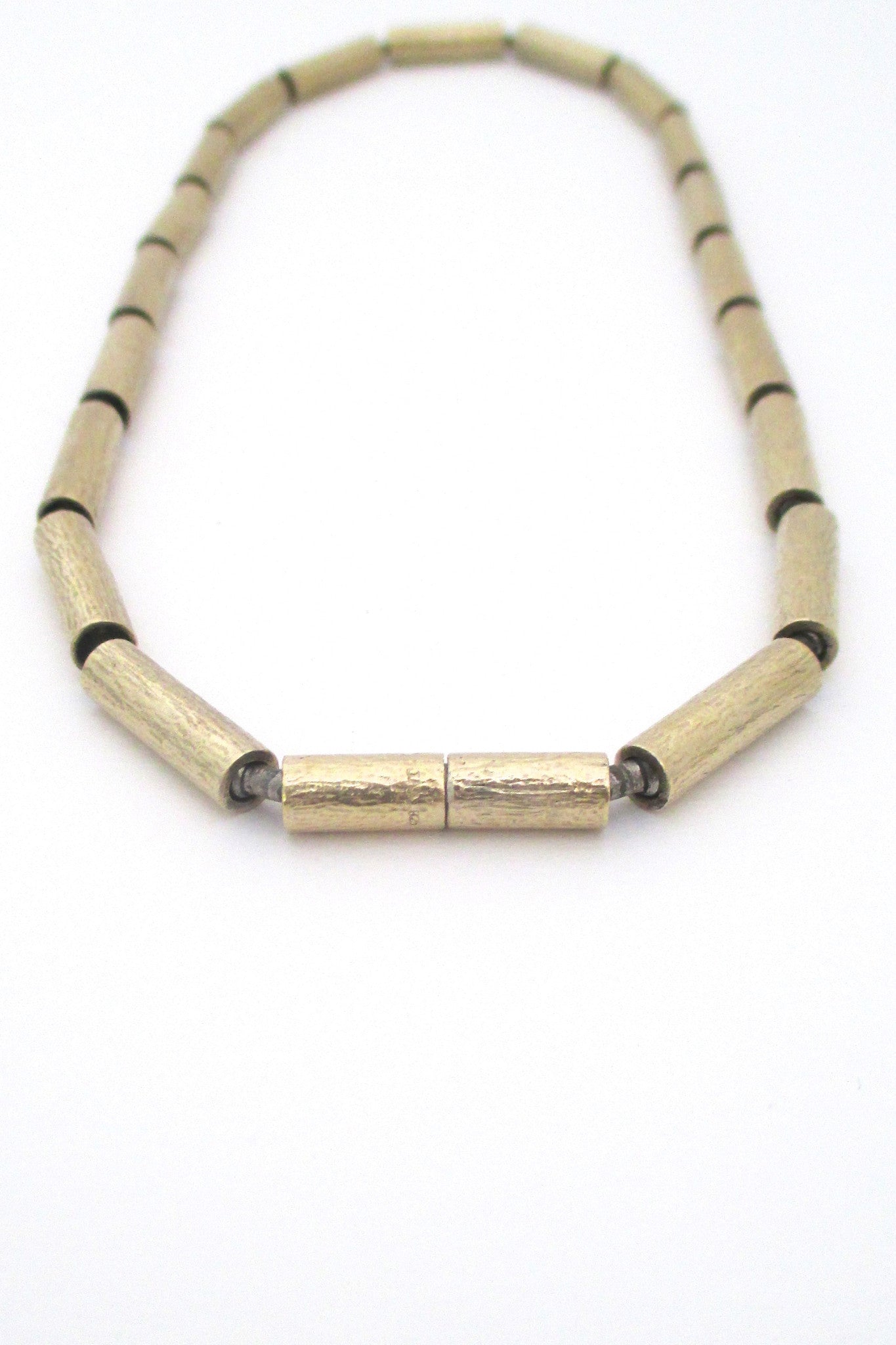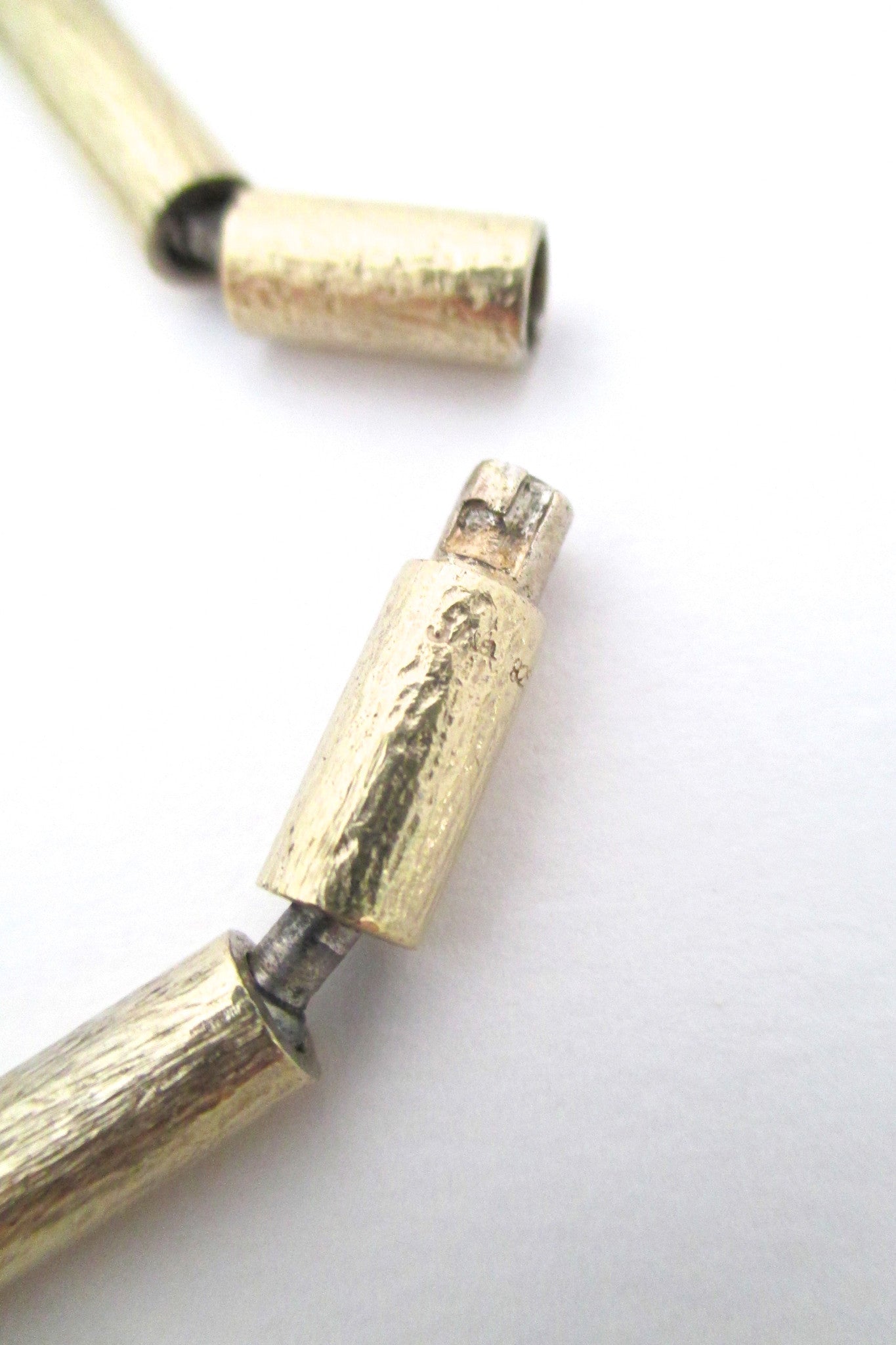 This expertly crafted necklace features textured silver gilt cylinders connected by unusual & clever links. Each connecting link moves freely on a pin inside the end of one cylinder and a ball & socket joint on the next. Its secure catch is also quite ingenious, with a simple push and turn mechanism.