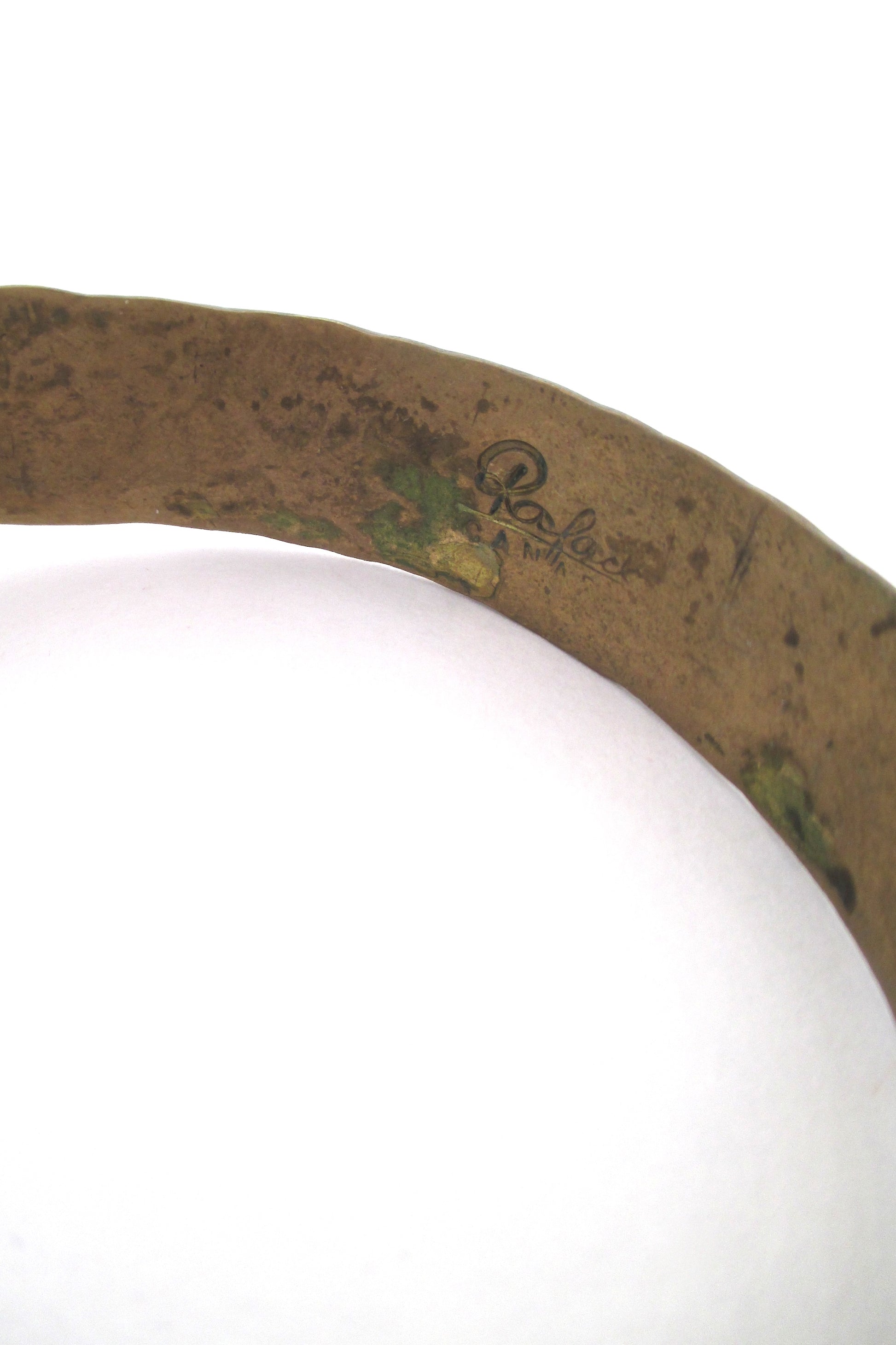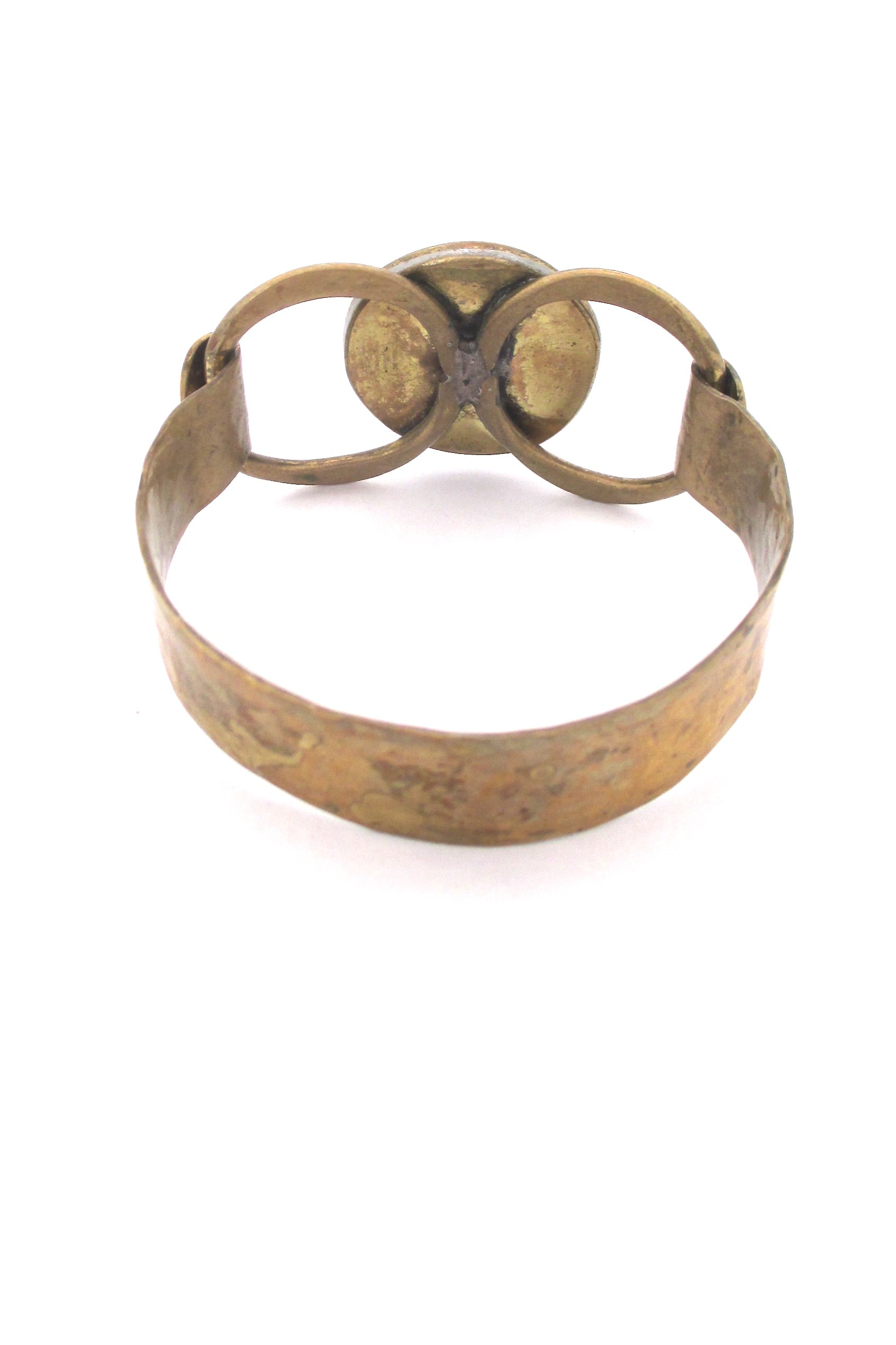 Rafael Canada hammered brass hinged bracelet ~ round amber glass stone