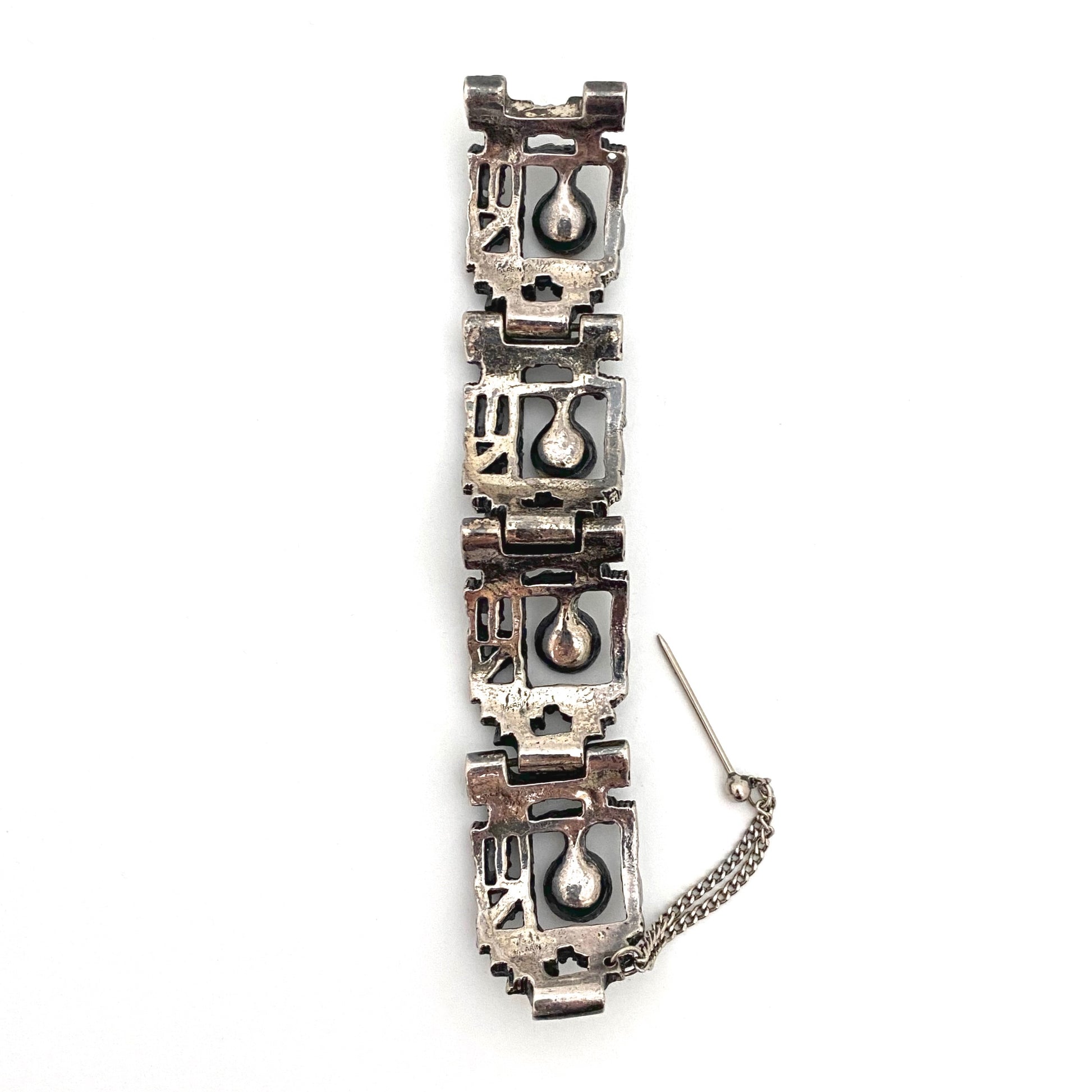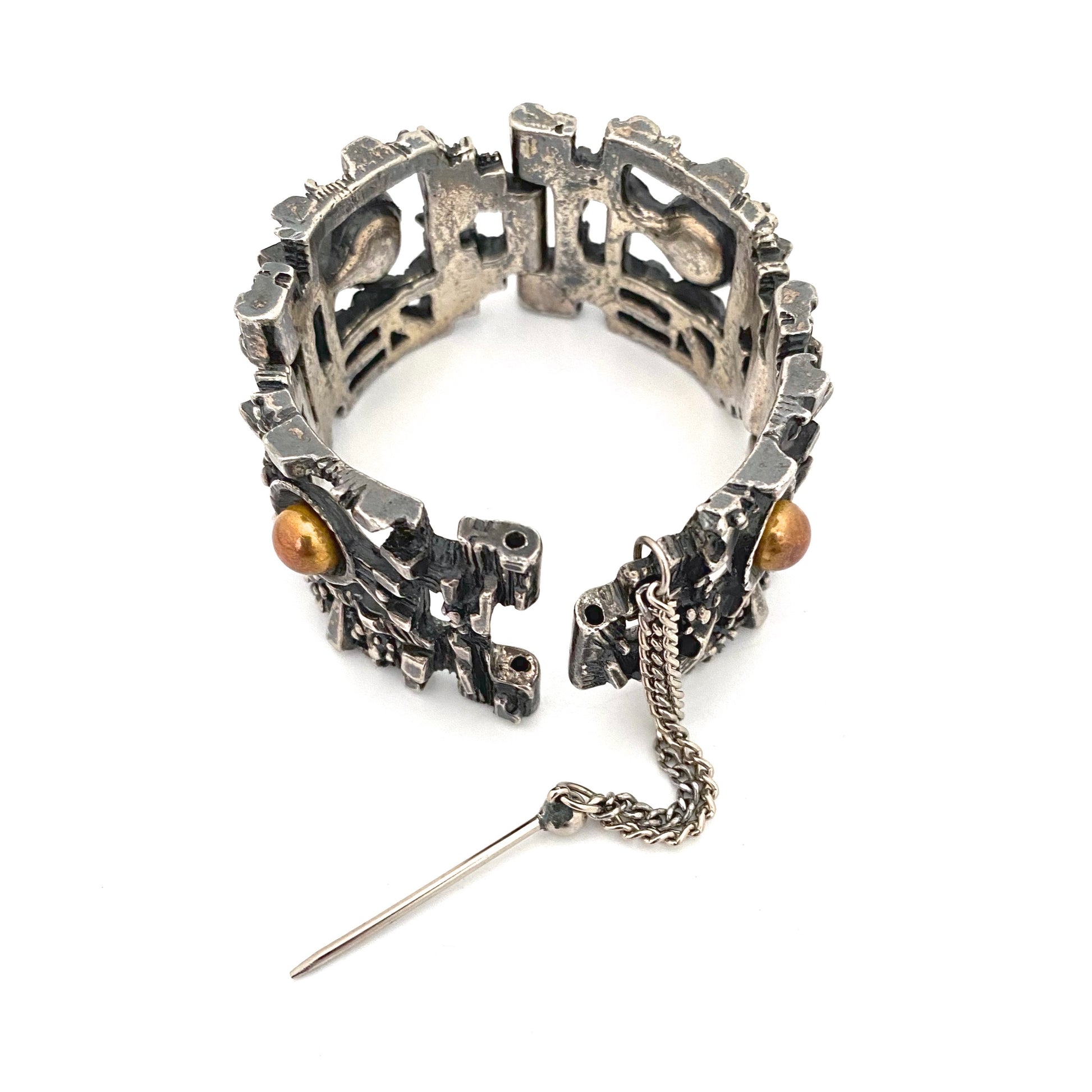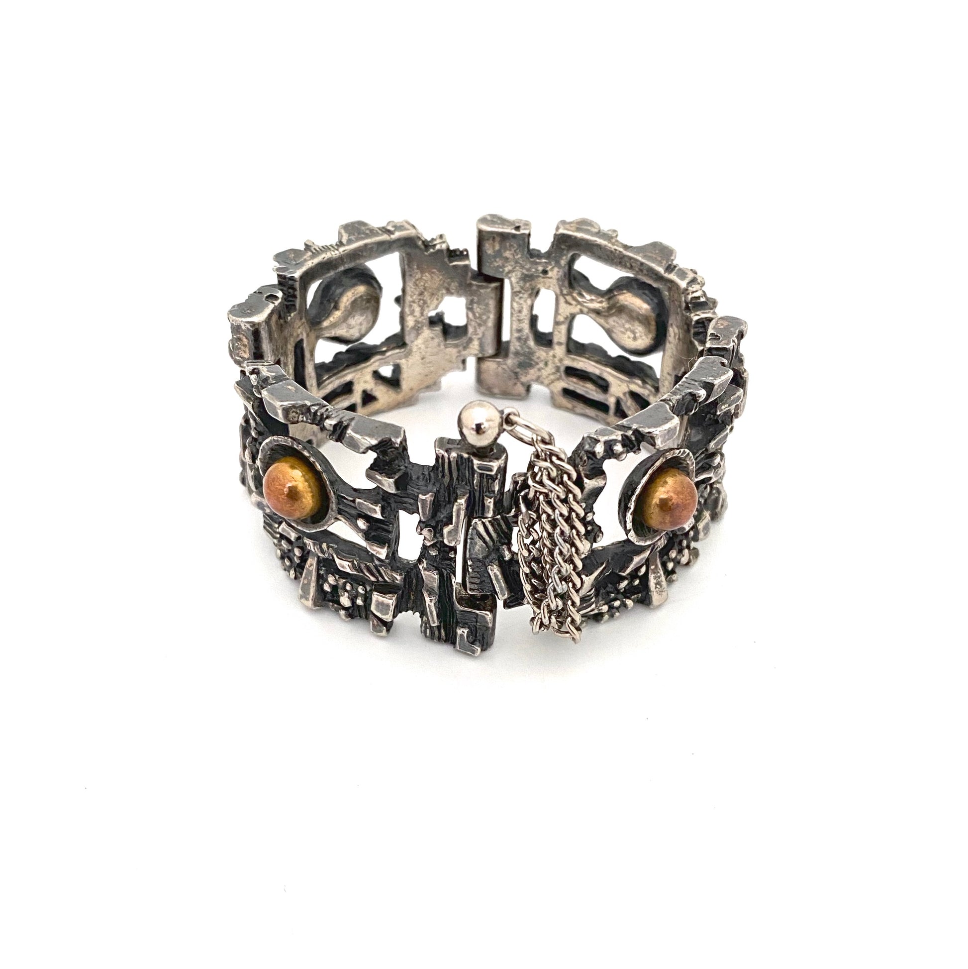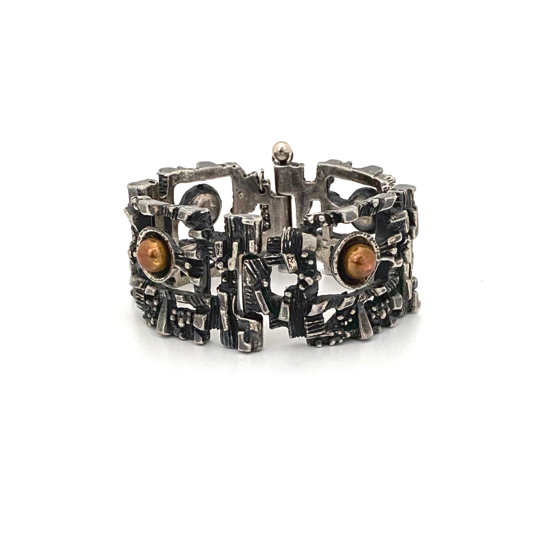 Robert Larin large brutalist pewter openwork panel link bracelet ~ bronze spheres